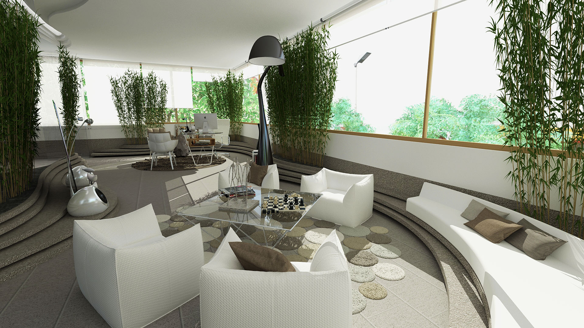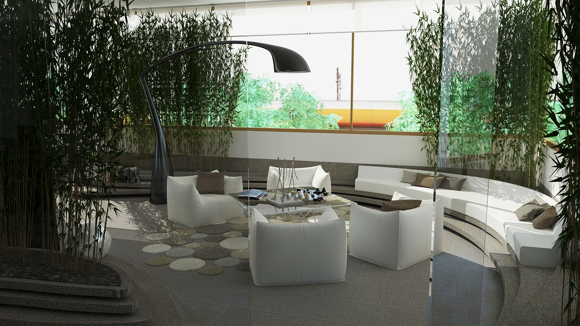 An office for the President of a petrol company. The lush interior design pays homage to Agojo's Office Naturescape installation in Milan, seen in the flowing lines of the low wall steps that double as seating and storage.