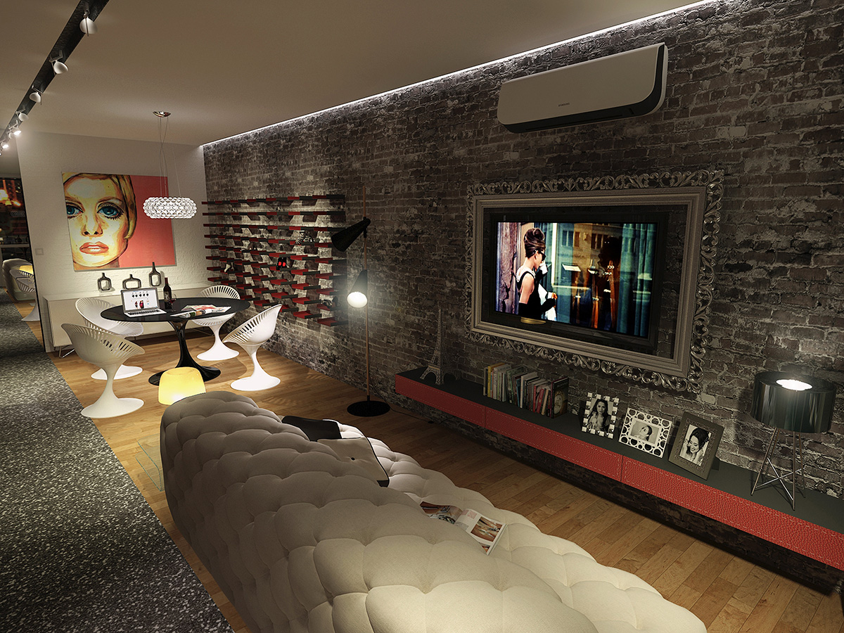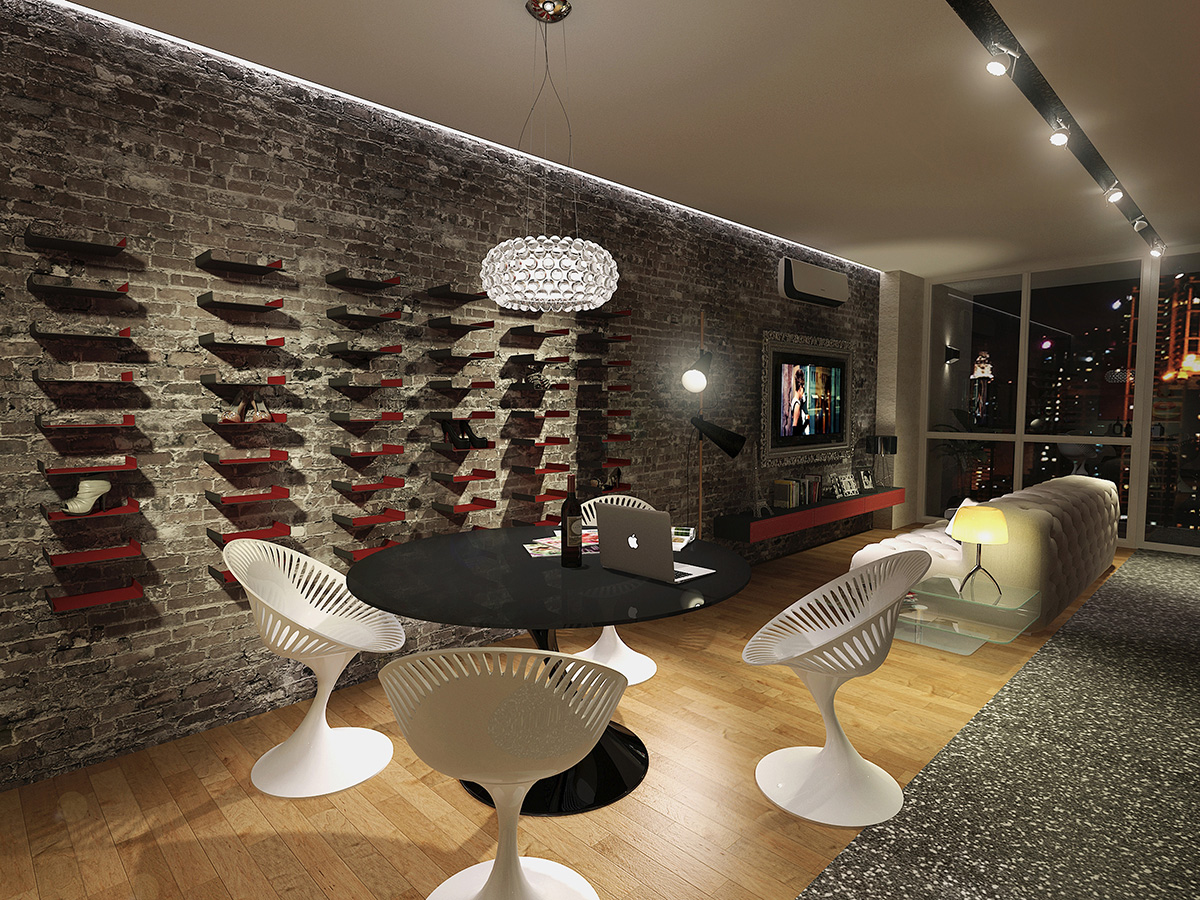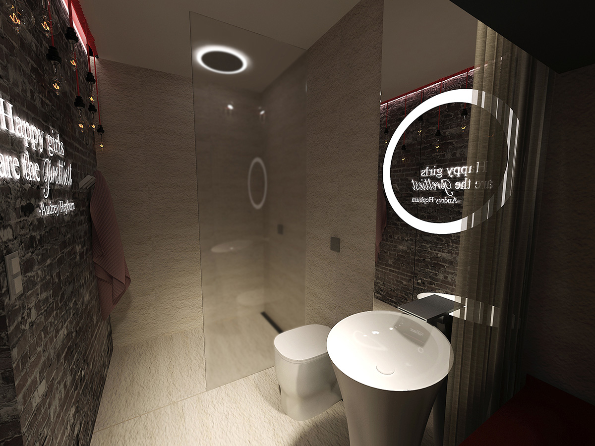 Heavily inspired by the grace and elegance of Audrey Hepburn, this hypothetical condo is designed to cater to a fashionista's whims. Walls separating the bedroom and living room were done away with to give the user generous room to try on and walk around in her various wardrobe. A glittery walkway cutting through the length of the condo lends a fashion show vibe to the space, while the shoe racks on the wall serve both a functional and ornamental purpose.