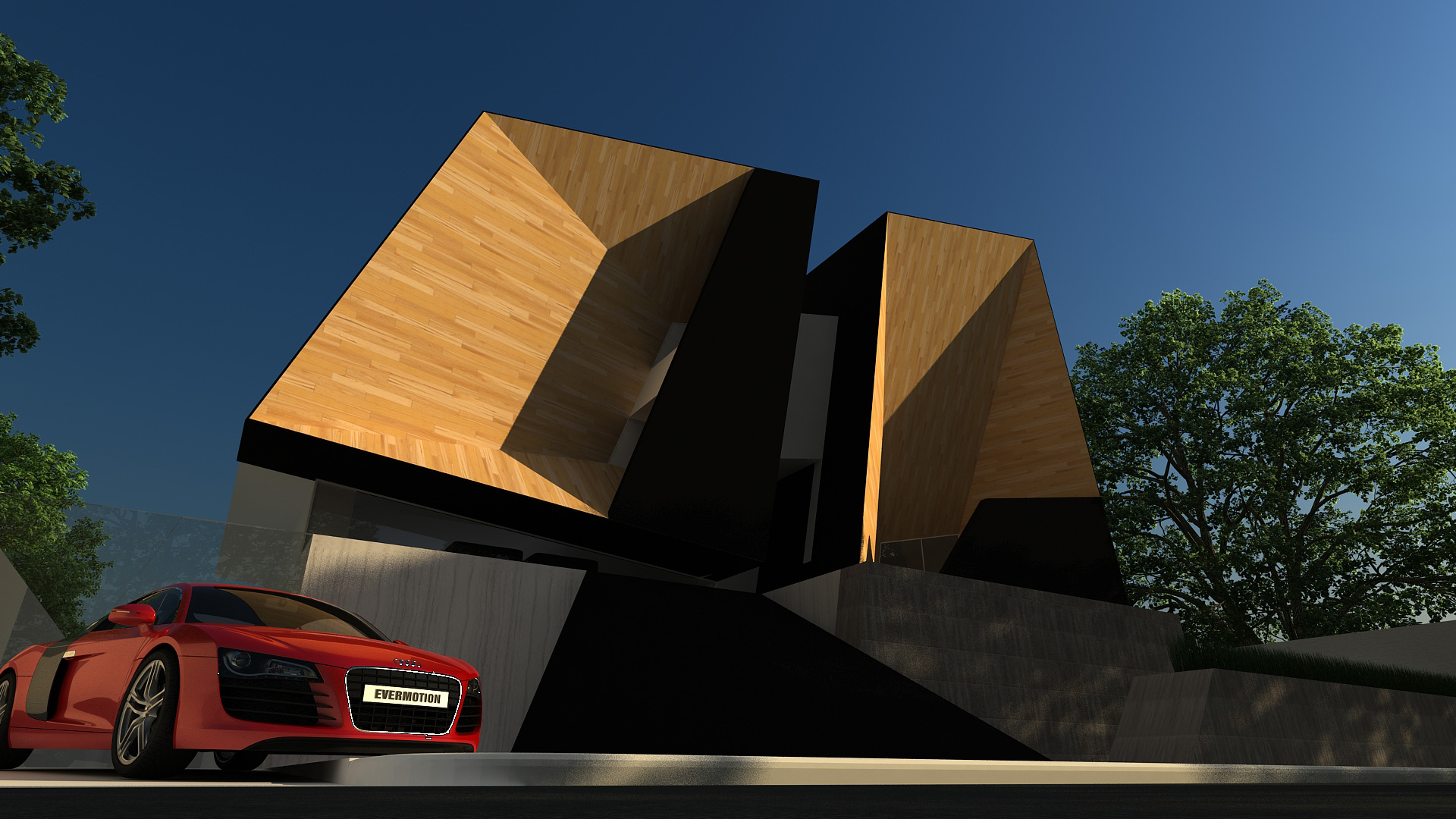 A house for an audiophile that borrows its form from a rabbit's ears. The house is split down the middle to create two volumes clad in wood, with the main entrance at the center bridging the two together. Through stretching the form beyond the XYZ plane, a geometric and sculptural structure was created.
