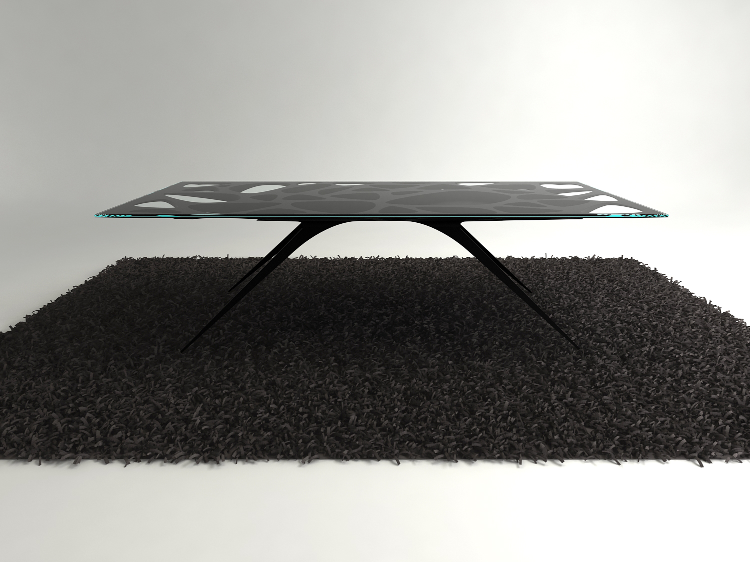 A steel table with a 3D-printed mesh topped with glass, inspired from the gnarly trees concealing witch's lairs in fairy tales. Another version, called Black Widow, has a solid black tabletop with a red spider outline at its center.
