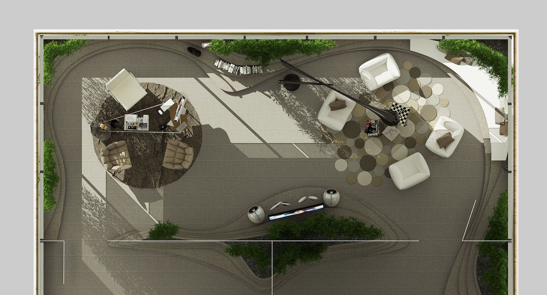 An office for the President of a petrol company. The lush interior design pays homage to Agojo's Office Naturescape installation in Milan, seen in the flowing lines of the low wall steps that double as seating and storage.