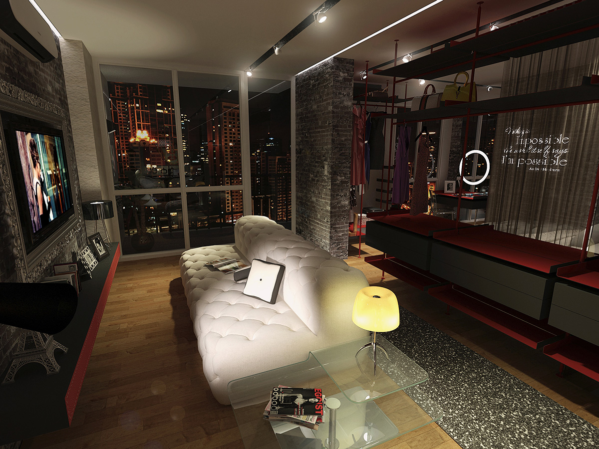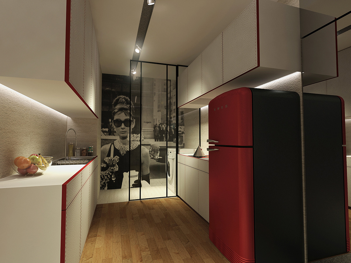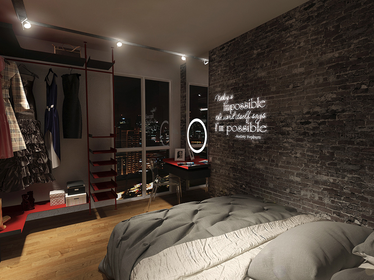 Heavily inspired by the grace and elegance of Audrey Hepburn, this hypothetical condo is designed to cater to a fashionista's whims. Walls separating the bedroom and living room were done away with to give the user generous room to try on and walk around in her various wardrobe. A glittery walkway cutting through the length of the condo lends a fashion show vibe to the space, while the shoe racks on the wall serve both a functional and ornamental purpose.