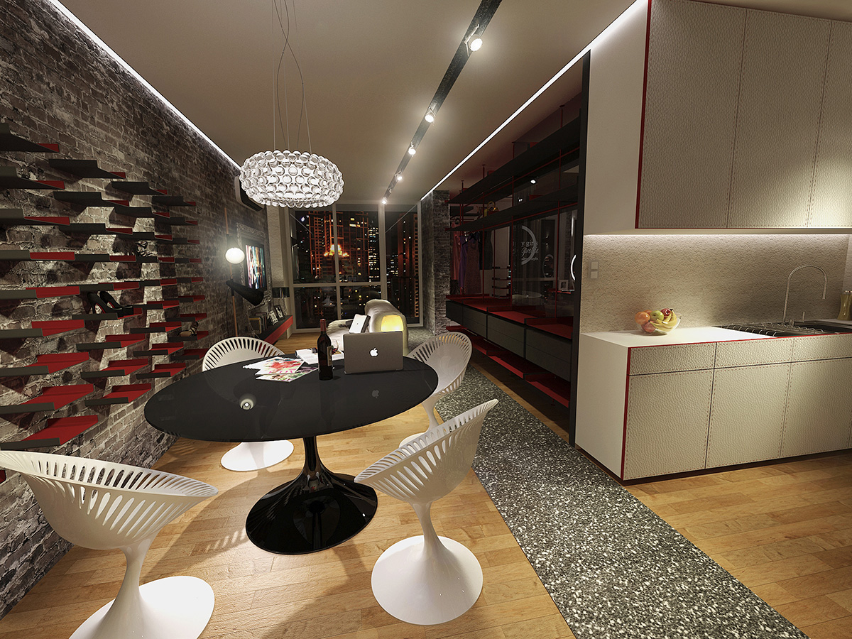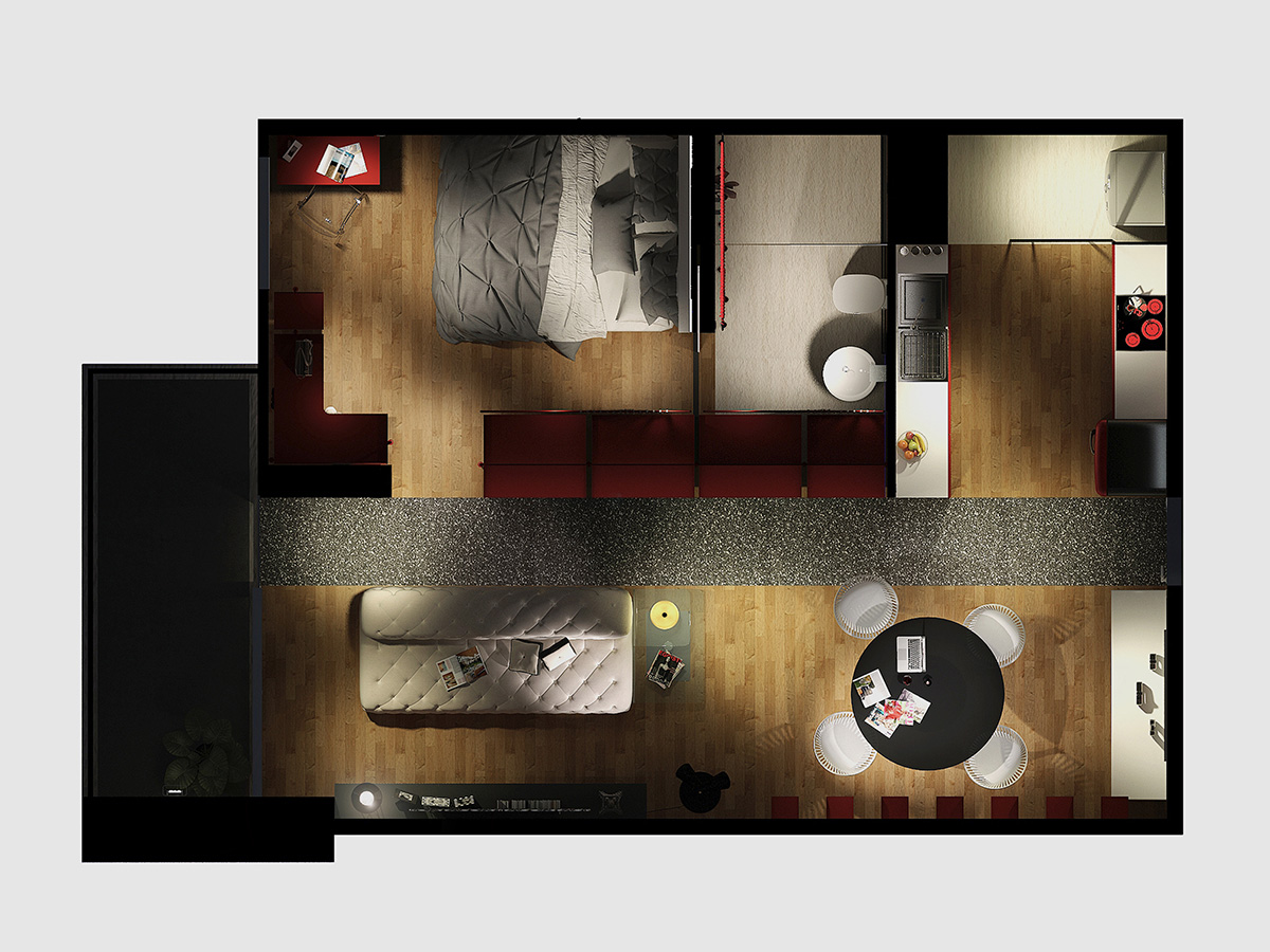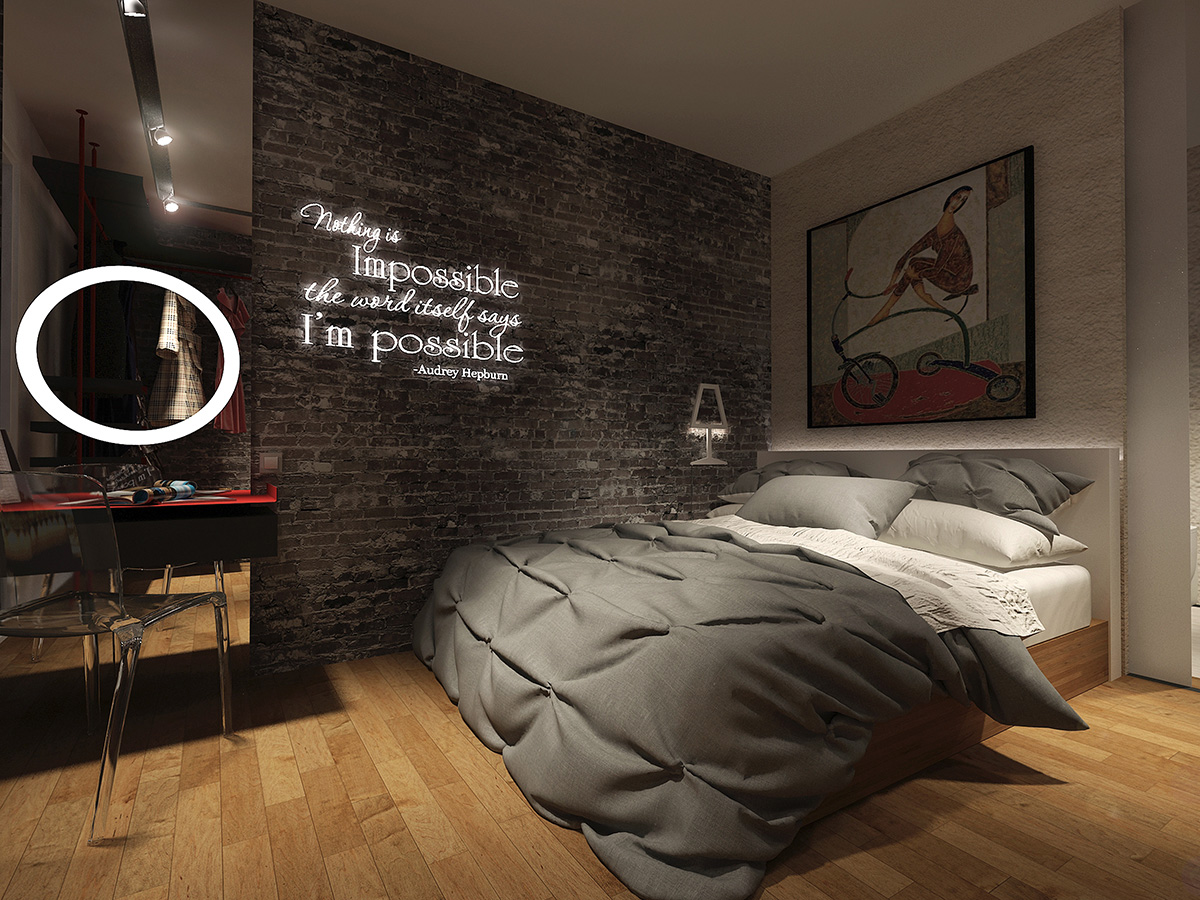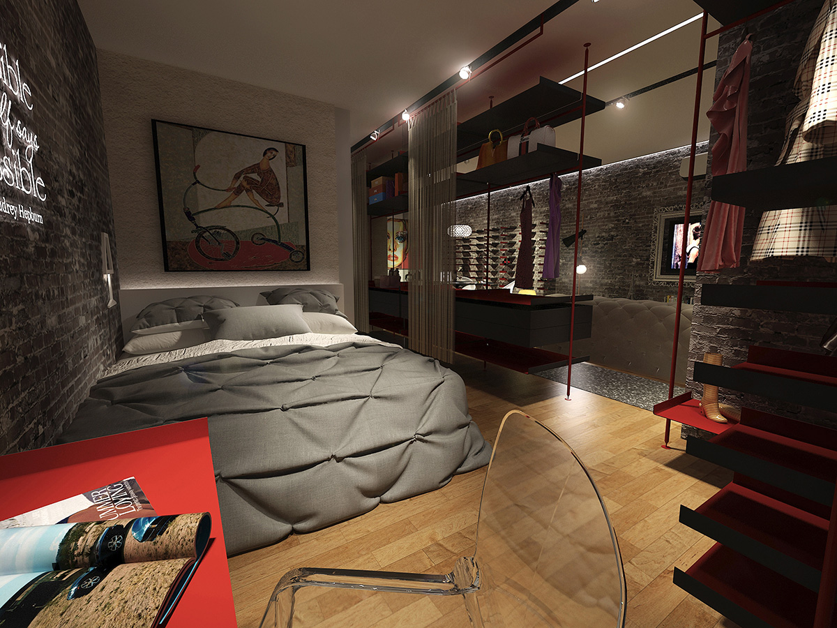 Heavily inspired by the grace and elegance of Audrey Hepburn, this hypothetical condo is designed to cater to a fashionista's whims. Walls separating the bedroom and living room were done away with to give the user generous room to try on and walk around in her various wardrobe. A glittery walkway cutting through the length of the condo lends a fashion show vibe to the space, while the shoe racks on the wall serve both a functional and ornamental purpose.
