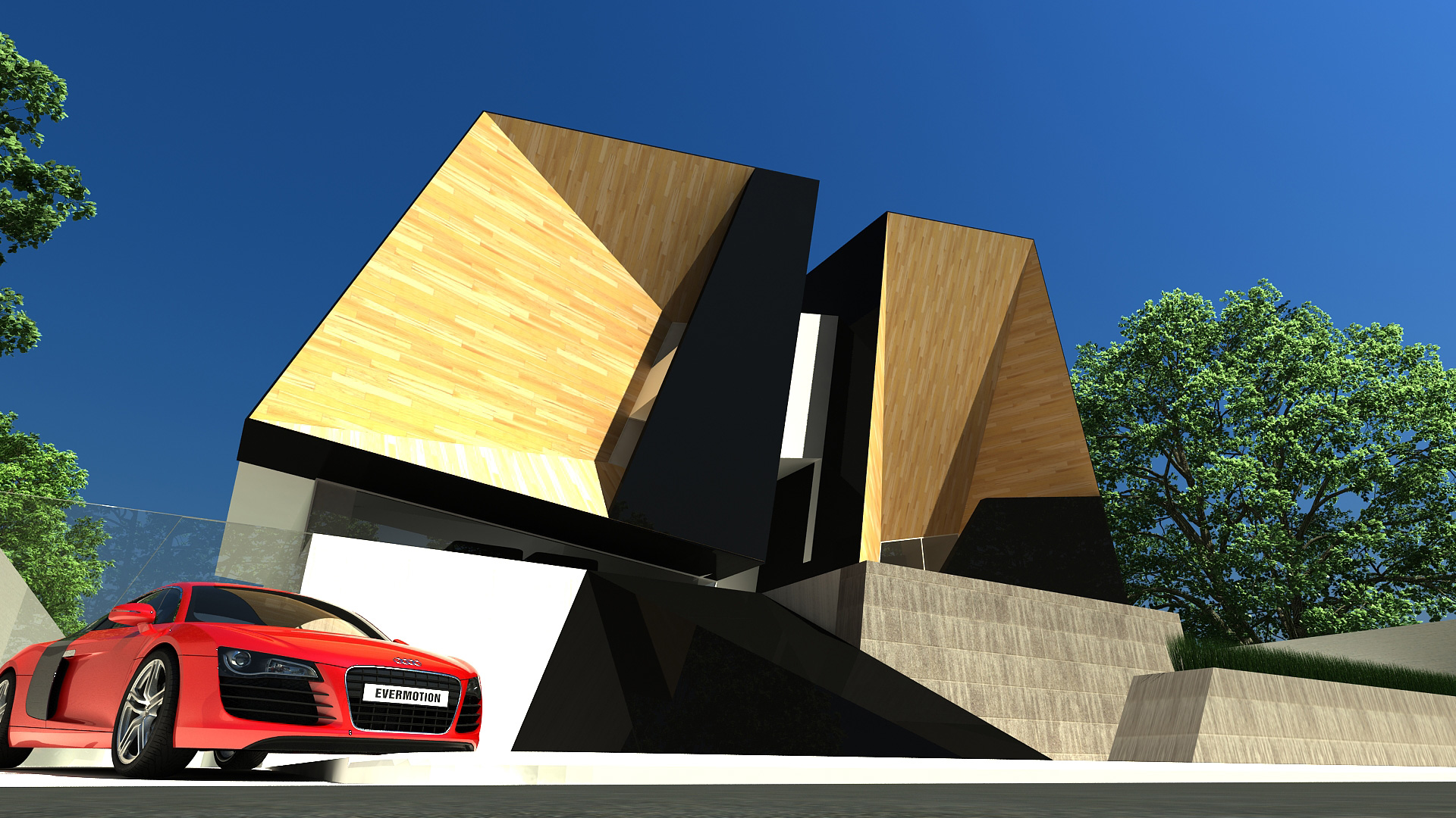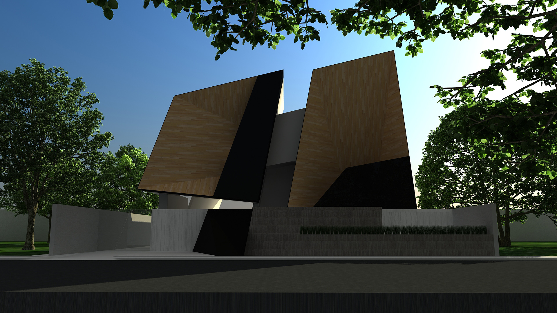 A house for an audiophile that borrows its form from a rabbit's ears. The house is split down the middle to create two volumes clad in wood, with the main entrance at the center bridging the two together. Through stretching the form beyond the XYZ plane, a geometric and sculptural structure was created.